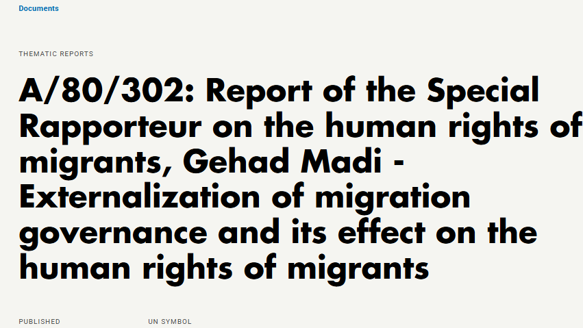 در مرداد ۲۰۲۵، دبیرکل سازمان ملل متحد گزارش تازهای را تحت عنوان «برونسپاری مدیریت مهاجرت و تأثیر آن بر حقوق بشر مهاجران» به مجمع عمومی ارائه کرد. این گزارش که توسط گهاد مادی (Gehad Madi)، گزارشگر ویژه حقوق بشر مهاجران، تدوین شده، به بررسی یکی از پدیدههای روبهگسترش در سیاستهای جهانی مهاجرت میپردازد: انتقال مسئولیت کنترل، پردازش و بازگرداندن مهاجران از کشورهای مقصد به کشورهای ثالث.